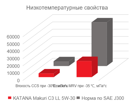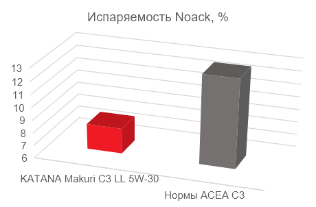 Благодаря применению синтетических базовых масел с низкой испаряемостью (тест NOACK) масло KATANA Makuri C3 LL 5W-30 характеризуется низким расходом на угар, что снижает объем доливок масла в двигателе от 1 до 2 литров в зависимости от условий эксплуатации и интервалов замены.